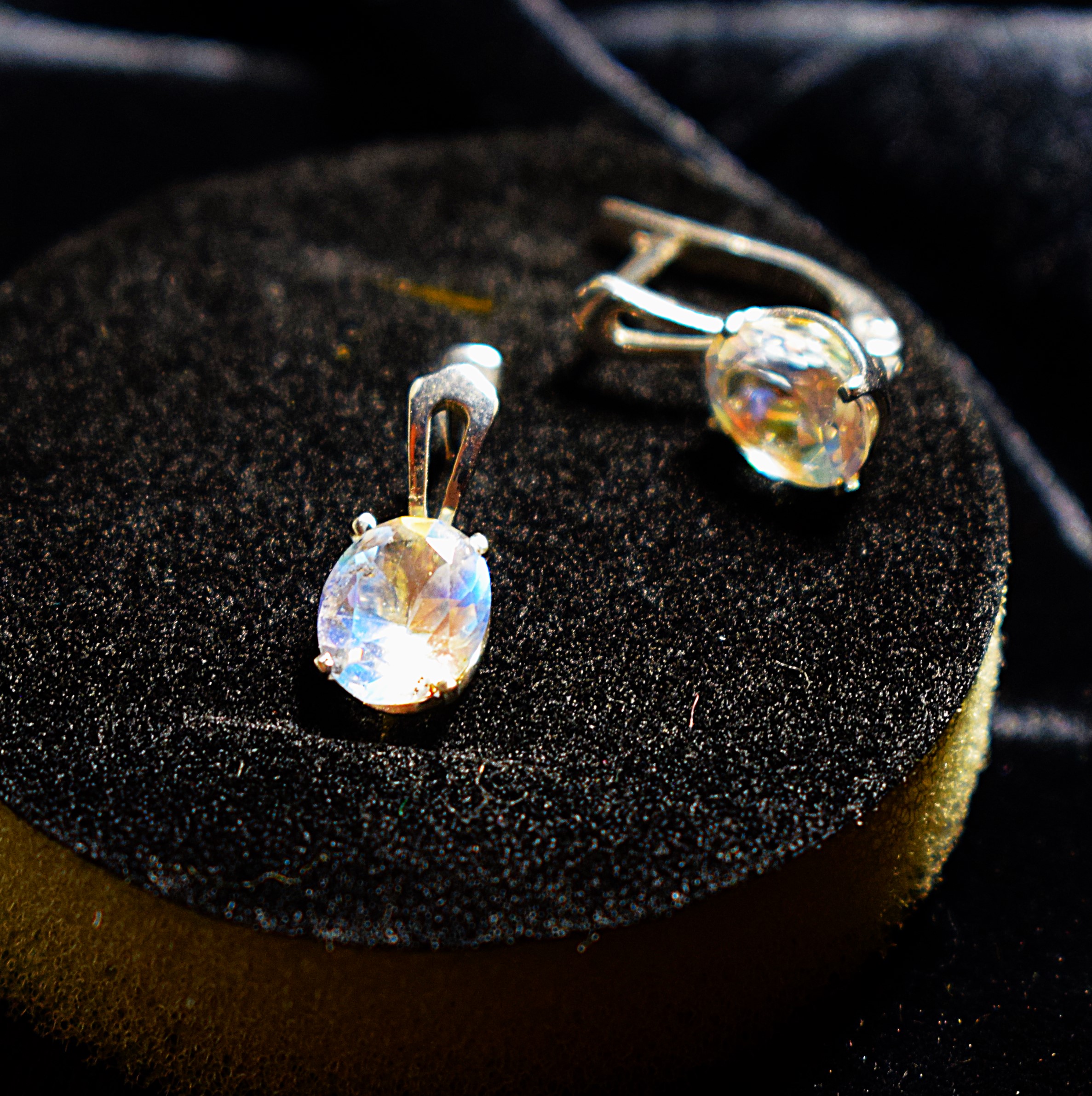 Серебряные серьги с природным радужным, лунным камнем, вес 2,554 гр.